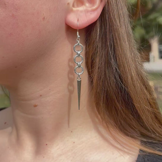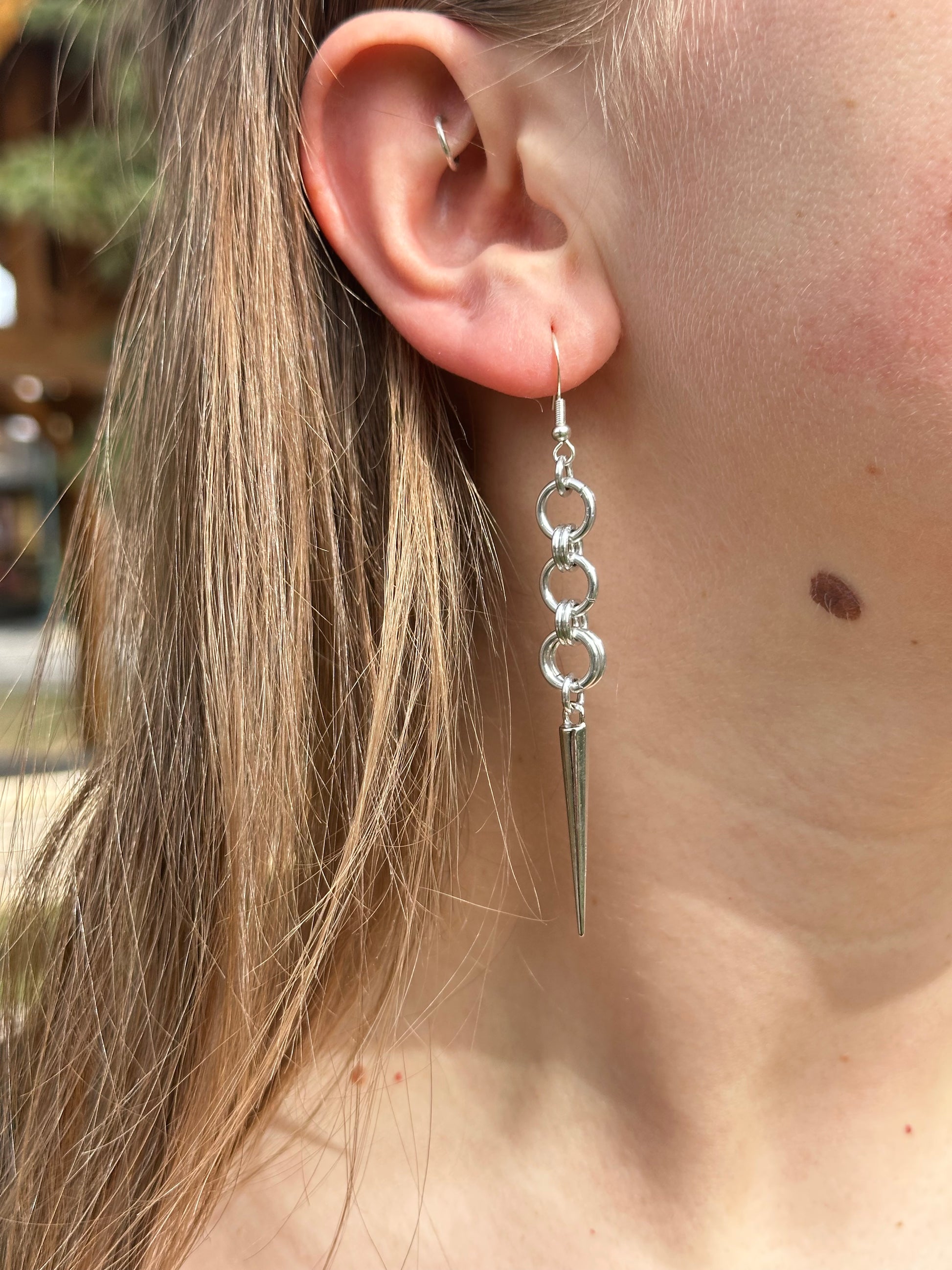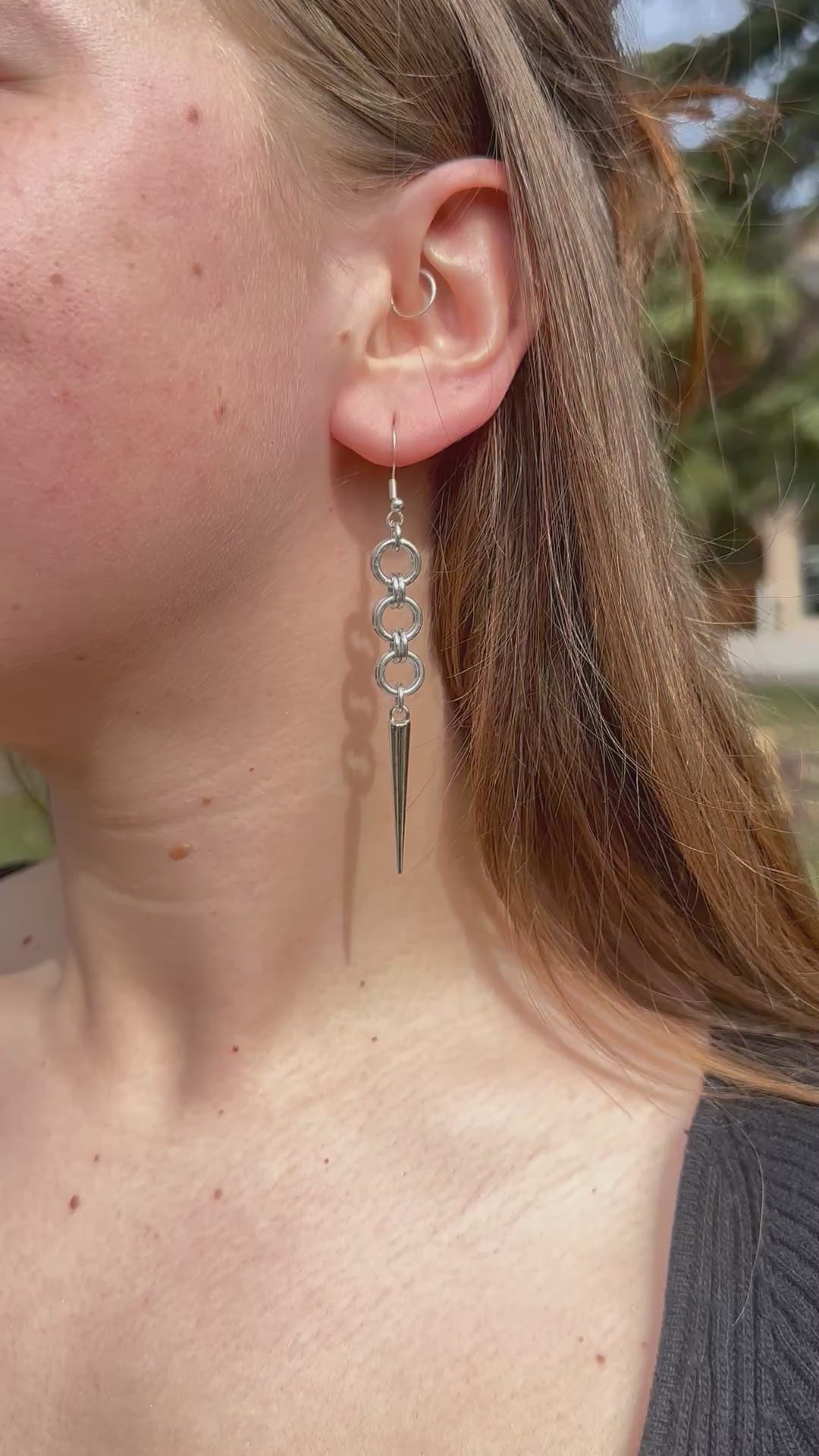 Minimalism meets rebellion with these elongated triple-ring spike earrings. Featuring four sleek interlinked rings that cascade into a bold stainless steel spike, this design creates a dramatic drop with a lightweight feel. Perfect for adding sharp, modern energy to your everyday looks or amplifying your night-out vibe.